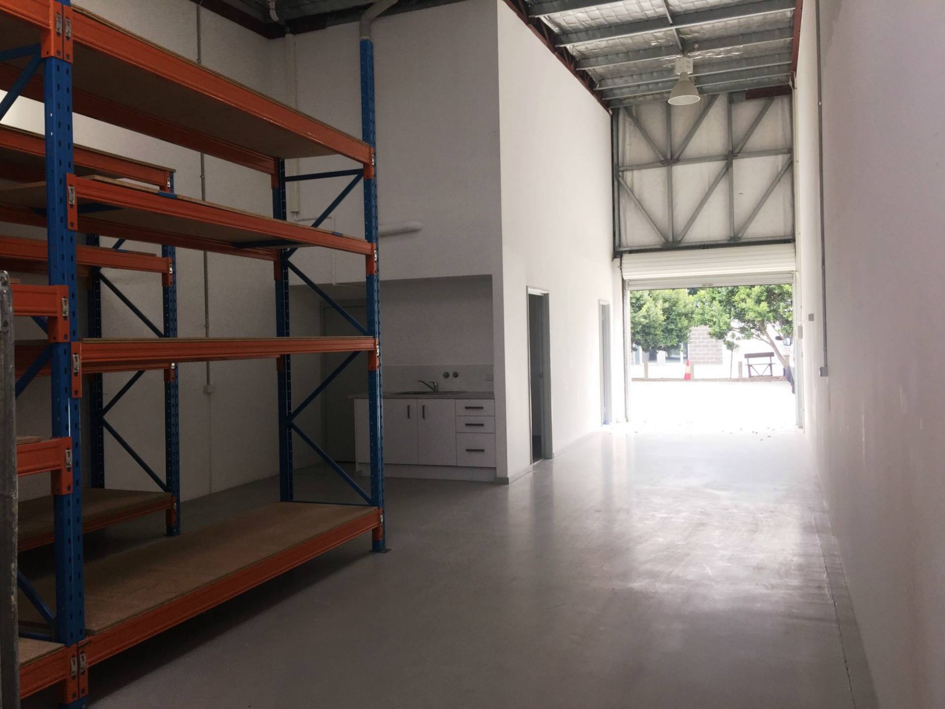 Two dedicated car bays for Unit 4. There are two rows of shelving fitted in the warehouse and a kitchen area.