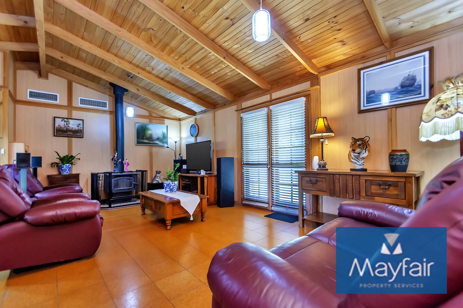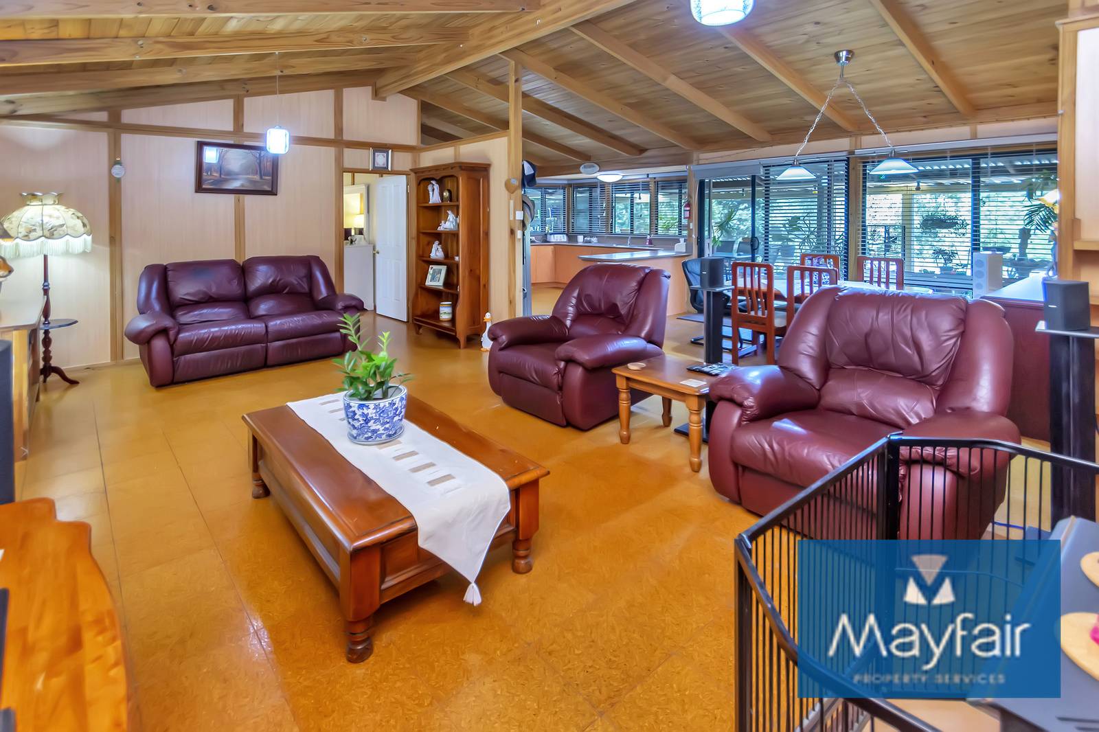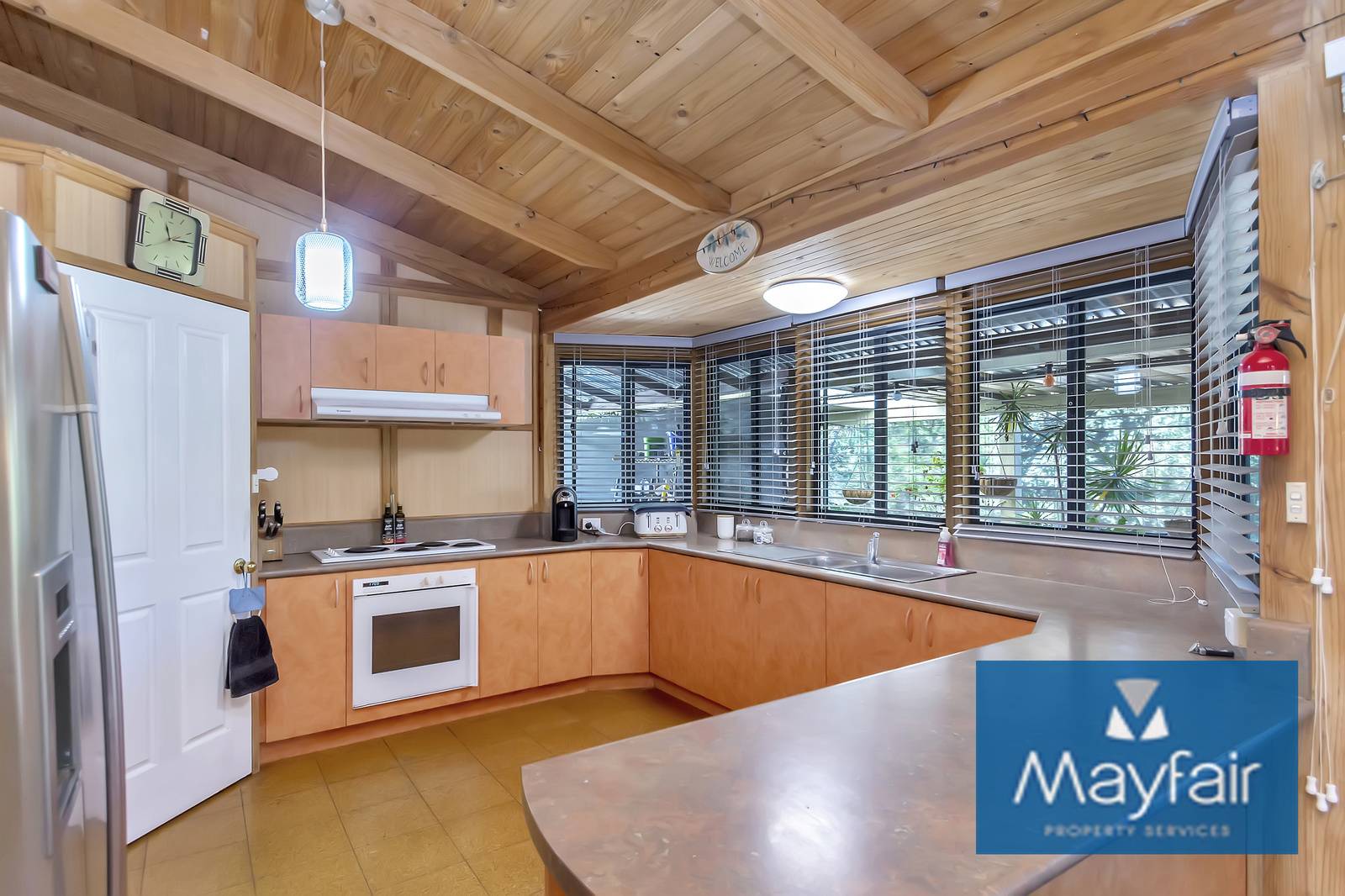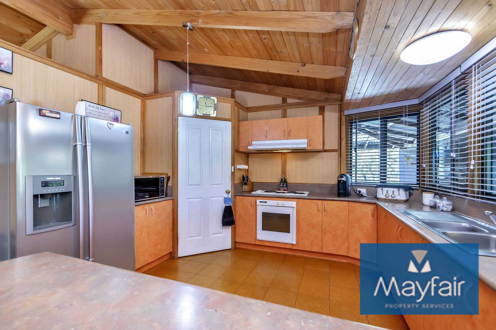 - Double door entry into a large open plan kitchen/lounge/dinging with high ceilings and wood fireplace.
