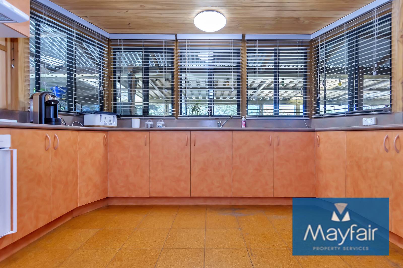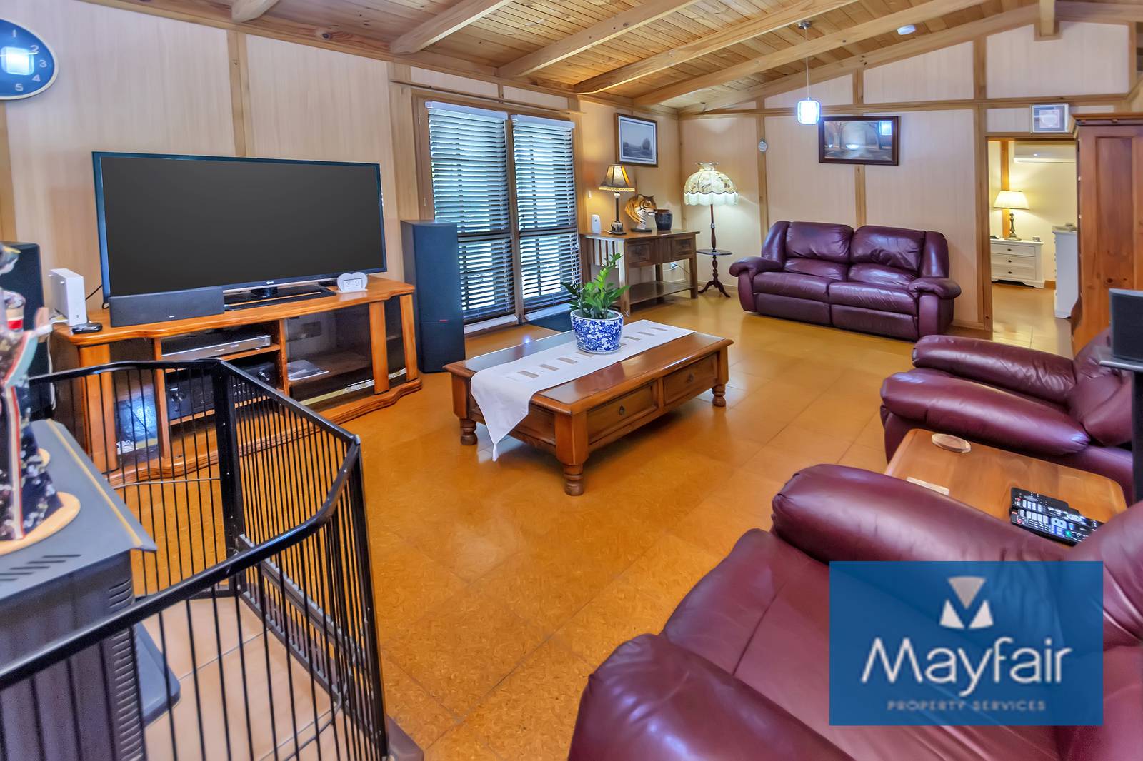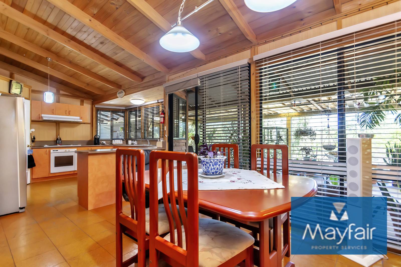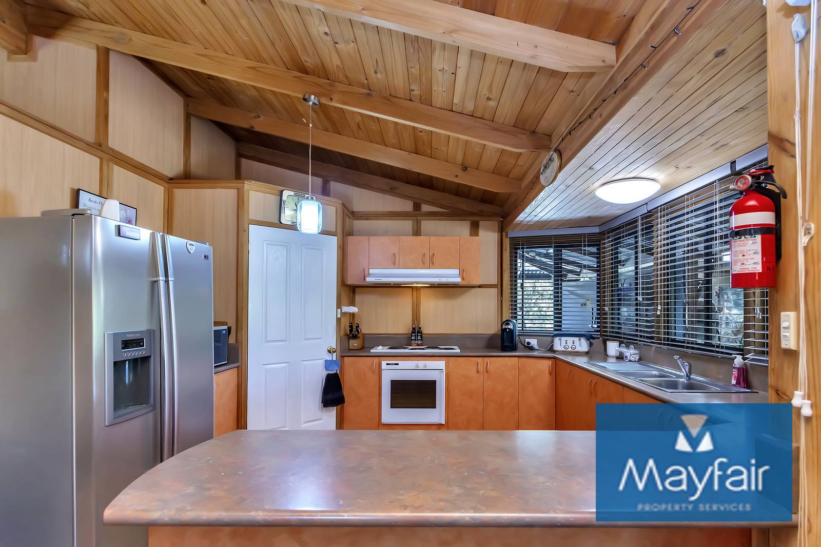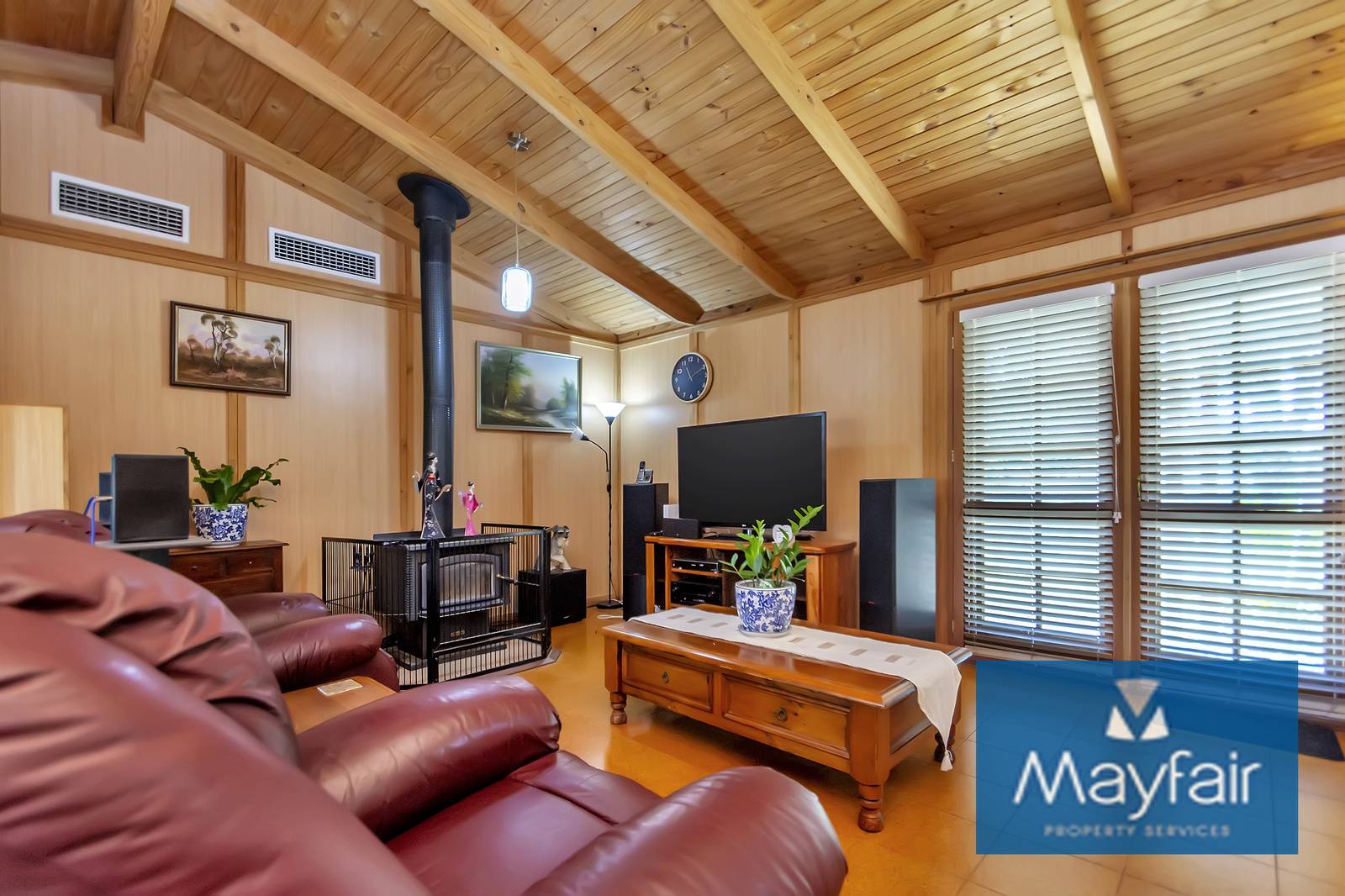 - Double door entry into a large open plan kitchen/lounge/dinging with high ceilings and wood fireplace.